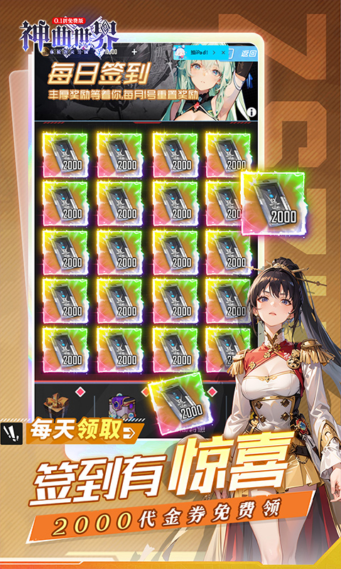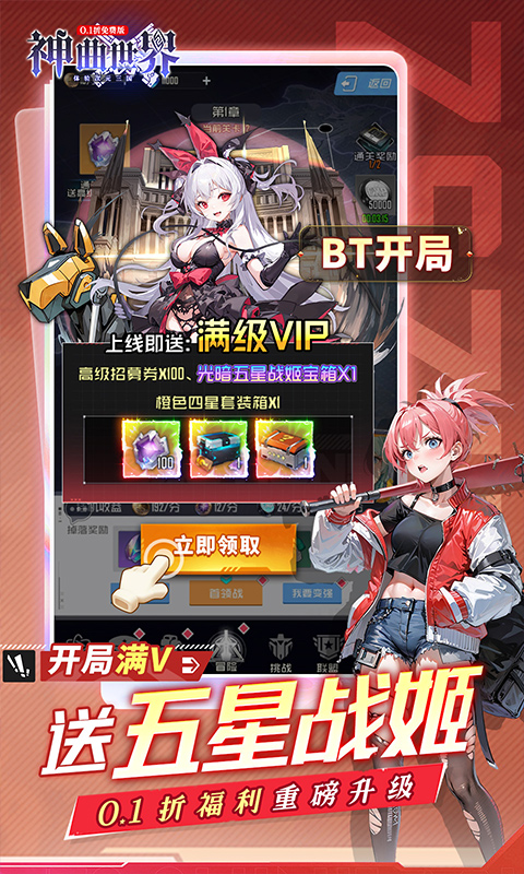 1、拒绝数值膨胀,首续全部0.1折 2、开局送满V,超觉五星,4星神装,百抽 3、闯关送连抽,超多五星战姬任意抽 4、连登8天送36位5星战姬 5、每天签到送2000代金劵